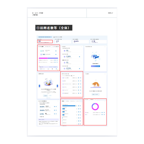 ヒートマップ解析ツール「Clarity」を使用して、ユーザーが「どこを見て」「どこで離れているのか」を見える化してレポートいたします。血色の悪い青い部分を赤い健康な色に変えていく。なんとなく感じていた課題も、データでしっかり確認できるので改善の方向性が明確に。