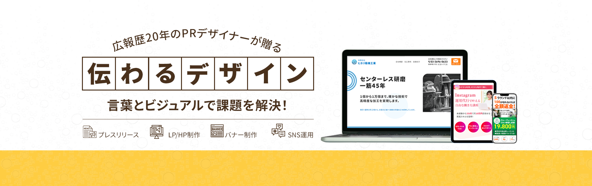 広報戦略から考え、プレスリリース作成・配信、SNS運用、バナーやLP/HP制作まで幅広くワンストップでサポート可能です。